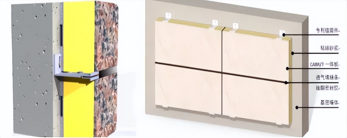 薄陶瓷一體板通過專用粘結(jié)材料,并利用專用錨固件,采用粘錨結(jié)合的方式固定于基層墻體,最終構(gòu)筑具有輕質(zhì)、裝飾、保溫、隔熱、防水、防火、系統(tǒng)安全可靠、施工方便、經(jīng)濟適用等特點的圍護結(jié)構(gòu)保溫系統(tǒng)。