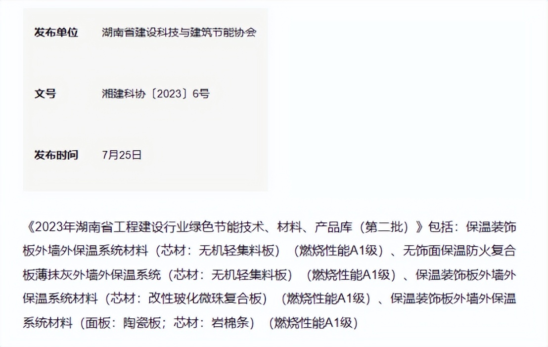 關(guān)于《湖北省推廣、限制和禁止使用建筑節(jié)能與綠色建筑產(chǎn)品、技術(shù)和設(shè)備目錄(2022版)》的公示,保溫裝飾板外墻外保溫系統(tǒng)列入推廣和使用目錄,相關(guān)信息如下:
